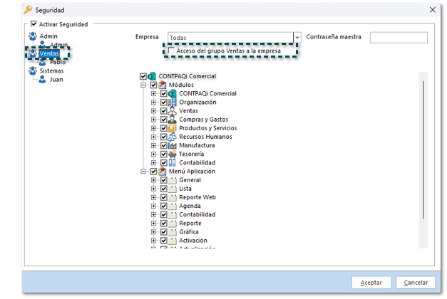 En esta versión, los usuarios de los grupos que tengan deshabilitada la opción Acceso del grupo XXXXX a la empresa, dentro de la Seguridad de la empresa, no podrán ver los nuevos módulos, consultas, reportes.... que se generen posterior a la configuración mencionada.