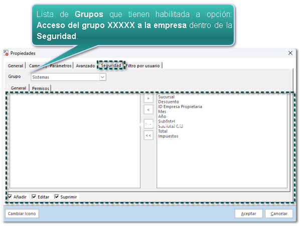 Si tienes grupos con la opción habilitada: Acceso del grupo XXXXX a la empresa, y deseas que no añadan módulos, consultas, reportes..., o bien no los editen o los eliminen, puedes hacer la configuración por grupo desde la Propiedades del elemento, en la pestaña Seguridad.