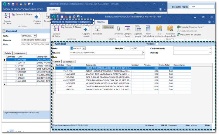A partir de esta versión, al crear una entrada de productos terminados a partir de una orden de producción, se generará el documento de entrada correspondiente.
