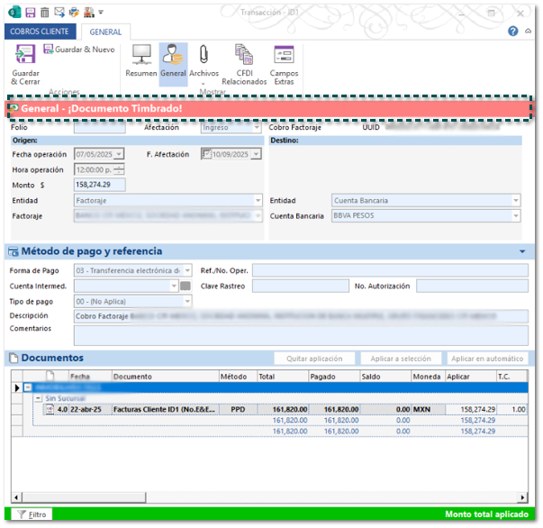 Anteriormente, al intentar timbrar un documento de Cobro Cliente con factoraje financiero, se mostraba el mensaje anterior, y no era posible timbrar el documento.