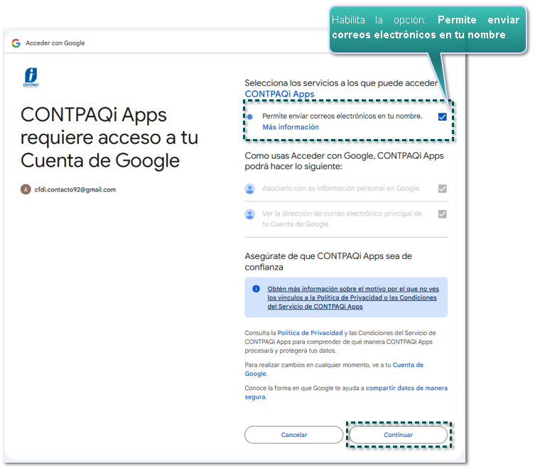 Habilita la opción Permite enviar correos electrónicos en tu nombre, y haz clic en Continuar.