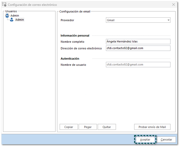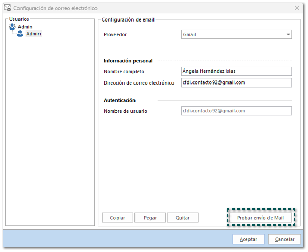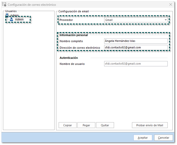 Dentro de la configuración de correos, en el usuario correspondiente, elige Proveedor = Gmail y asigna los datos de Información personal.