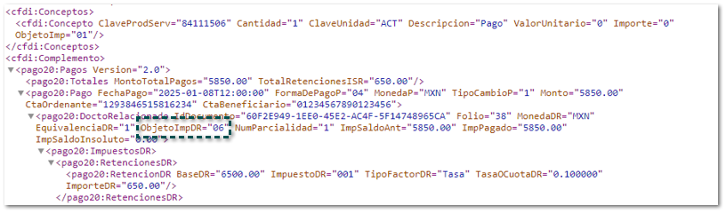 Dentro del XML en el atributo ObjetoImpDR se asumirá el valor de la clave correspondiente, ejemplo: 06 (Sí objeto del IVA, No traslado IVA).