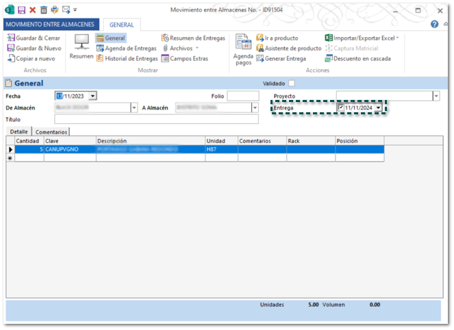 A partir de esta versión, se hará efectiva la entrega de los documentos de Movimientos entre almacenes cuando se habilite la opción Entrega, y se verá reflejada en el Kardex como cantidad entregada.