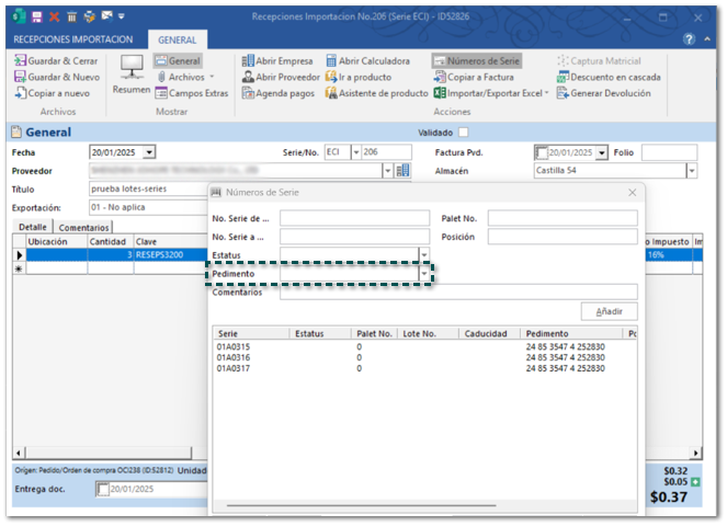 En esta versión, al generar un documento de recepción de compra que cuente con movimientos de productos con manejo de pedimento y número de serie, dentro de la ventana de captura se mostrará el campo Pedimento para que puedas agregar los datos disponibles.