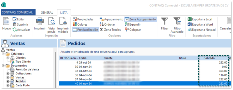 Anteriormente, la columna Cobrado de los documentos de pedidos se mostraba en cero aun cuando se tenía un cobro cliente relacionado al documento; esto sucedía después de realizar la entrega masiva de los pedidos.