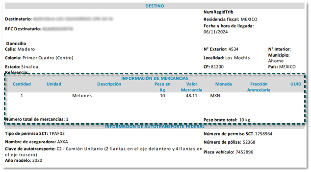 En esta versión, al visualizar el PDF de un documento de factura cliente con complemento carta porte, se mostrará la información de las secciones ITSMO y Mercancías.
