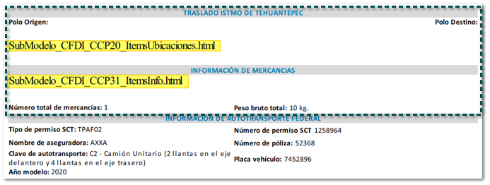 Anteriormente, al visualizar el PDF de un documento de factura cliente con complemento carta porte, no se mostraba la información de las mercancías, mostrando el nombre del submodelo que trae esa información.
