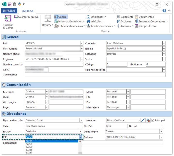 Anteriormente, al registrar una nueva empresa que tenía el CP: 27259, el sistema indicaba que se código postal no existía, y no era posible registrarlo.