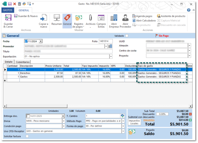 Anteriormente, al asignar un tipo de gasto en los movimientos de un documento de Gastos, no se respetaba el valor asignado, lo que ocasionaba que la póliza se generara a una cuenta diferente.