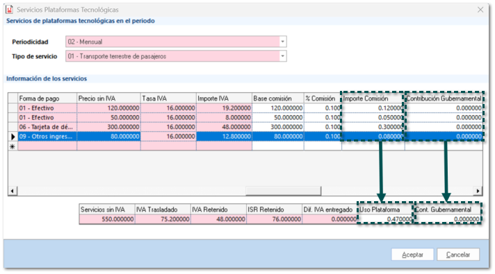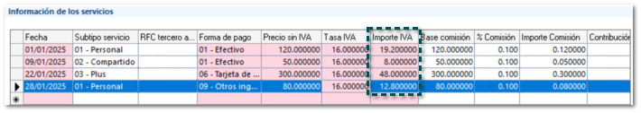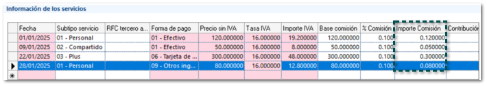 ![]() Importe Comisión se calcula multiplicando el valor de Base comisión por el % comisión, por cada servicio.