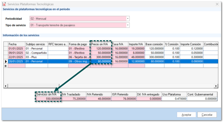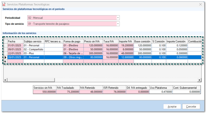 En la sección Información de los servicios, captura los datos de cada servicio que desees registrar en el documento.