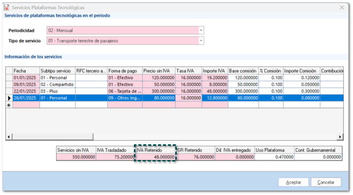 Enseguida te mostramos un ejemplo de captura de Factura de Retenciones para un proveedor nacional: PÚBLICO EN GENERAL (XAXX010101000) con Tipo de Servicio = 01 - Transporte terrestre de pasajeros.