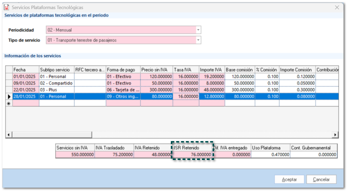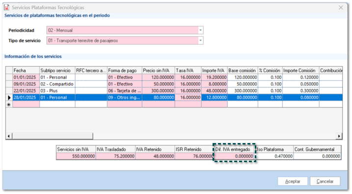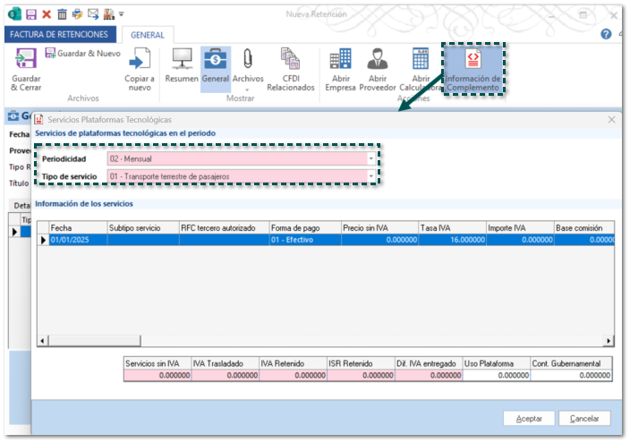 Haz clic en el botón Información de complemento, y se mostrará la siguiente ventana; indica la Periodicidad y el Tipo de servicio.