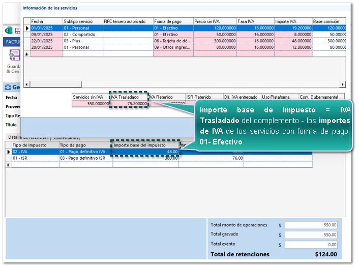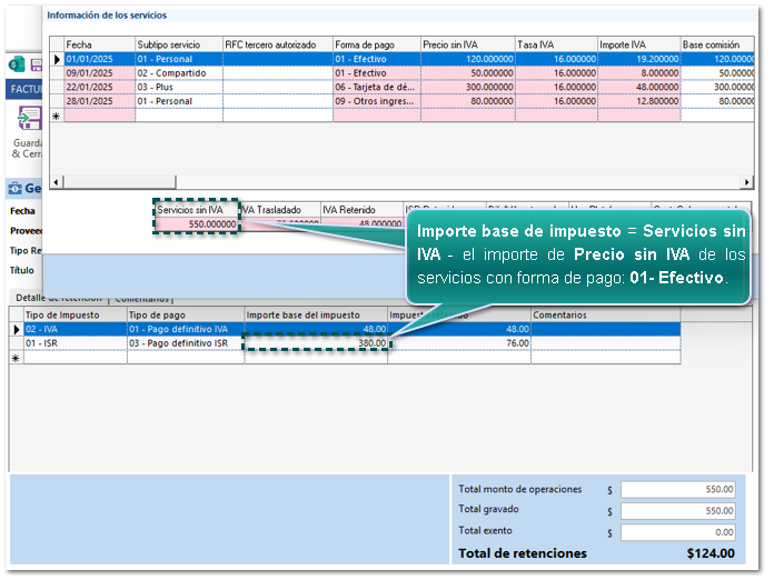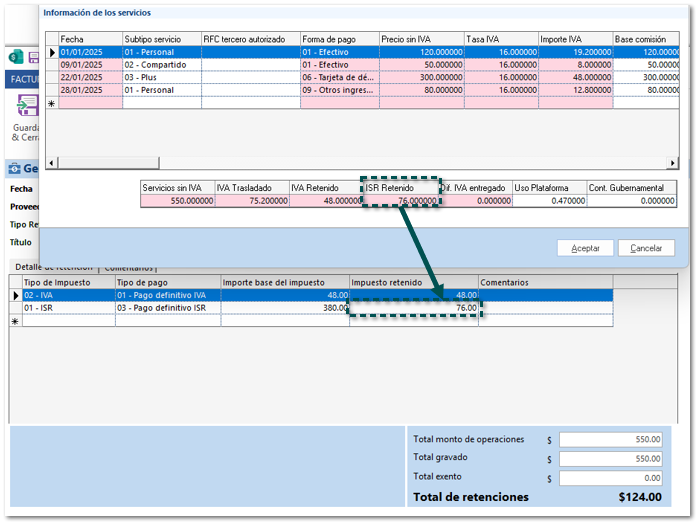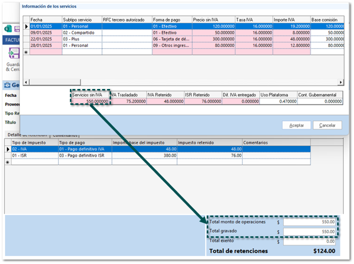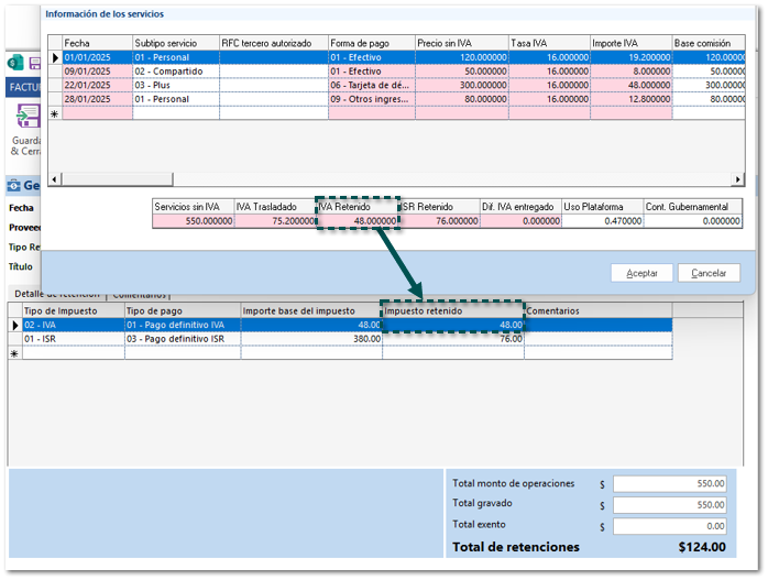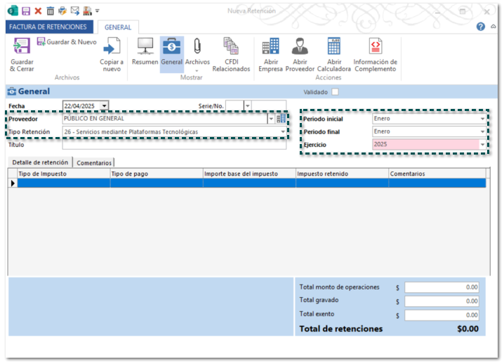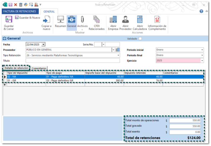 Podrás ver que la información del Detalle de retención y el área de totales, se llena e automático.