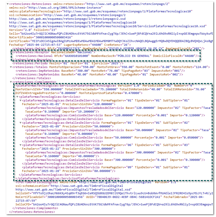 ISR Retenido = 380.00 * 0.20 (el valor se obtiene del catálogo c_TipoDeServ y Ejercicio) = 76.00