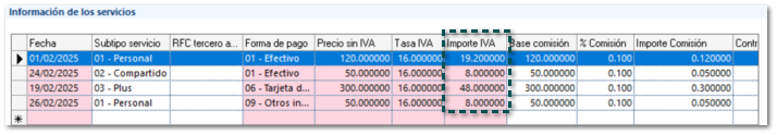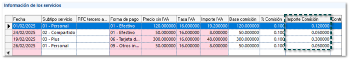 Importe Comisión se calcula multiplicando el valor de Base comisión por el % comisión, por cada servicio.