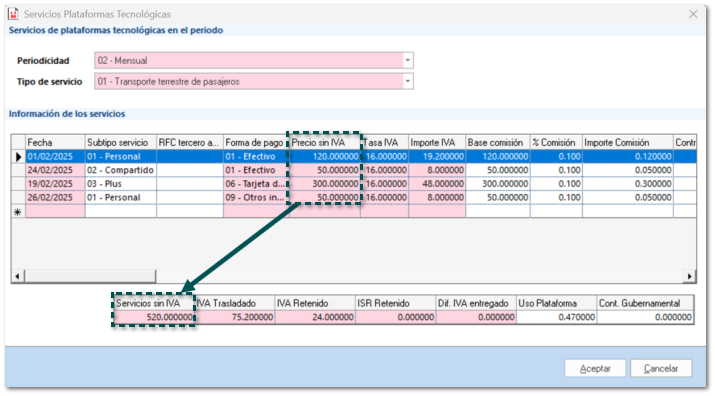 Servicios sin IVA = suma total del Precio sin IVA de los servicios registrados.