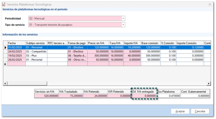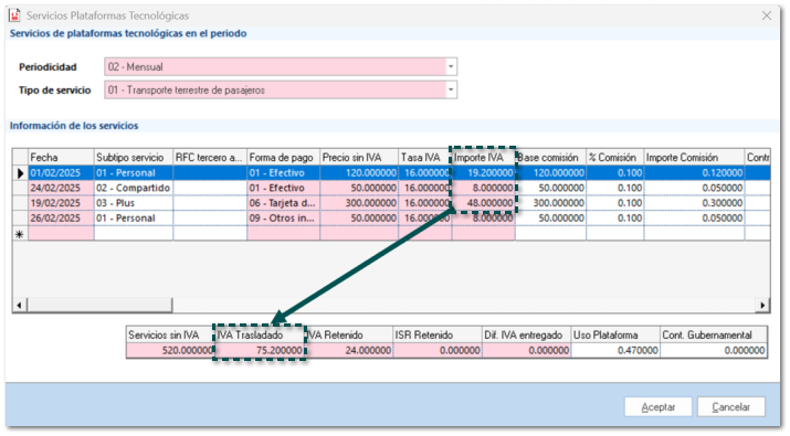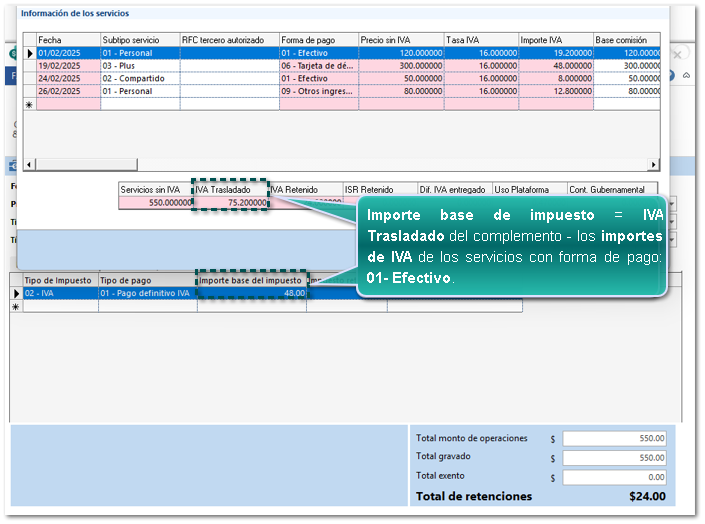 El cálculo del Importe base de impuesto se obtiene de la siguiente fórmula (IVA Trasladado del complemento - los importes de IVA de los servicios con forma de pago: 01- Efectivo).