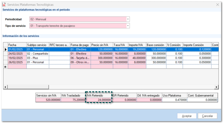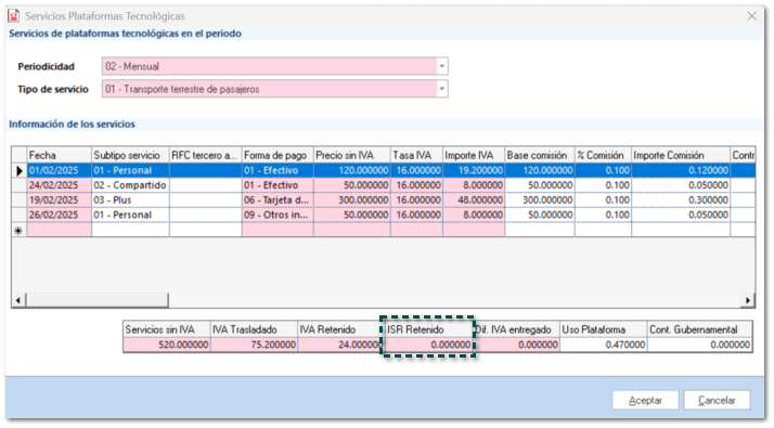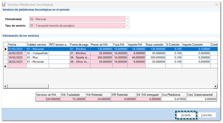Haz clic en el botón Información de complemento, y se mostrará la siguiente ventana; indica la Periodicidad y el Tipo de servicio.