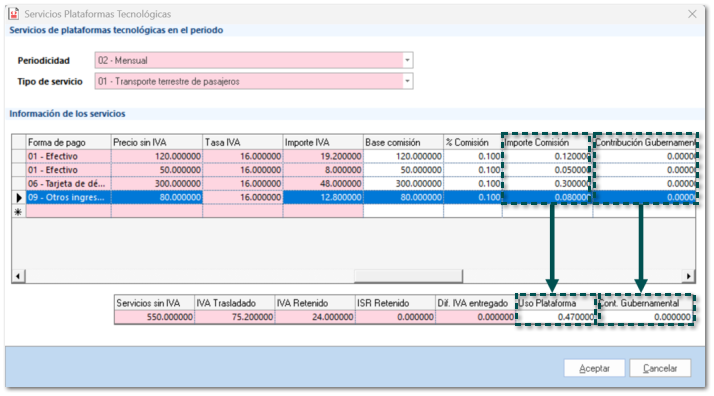 Los importes de Uso Plataforma y Cont. Gubernamental es la suma total de las columnas Importe Comisión y Contribución gubernamental respectivamente.