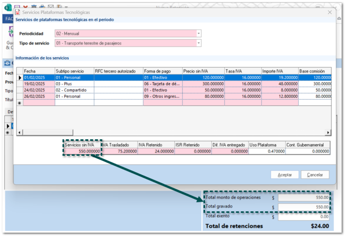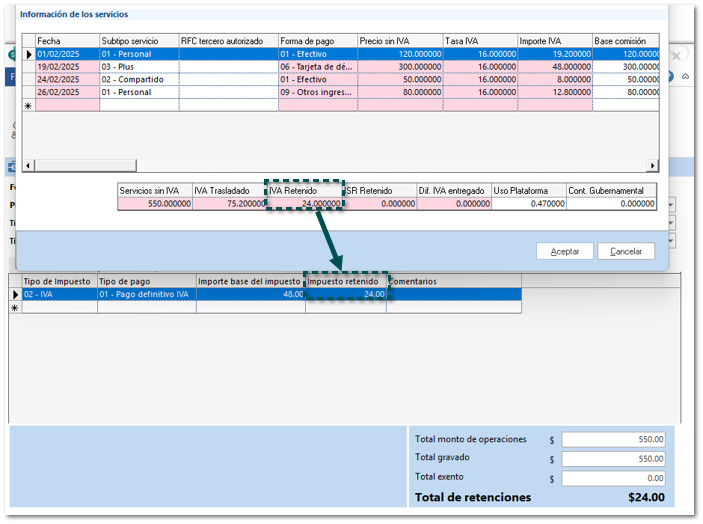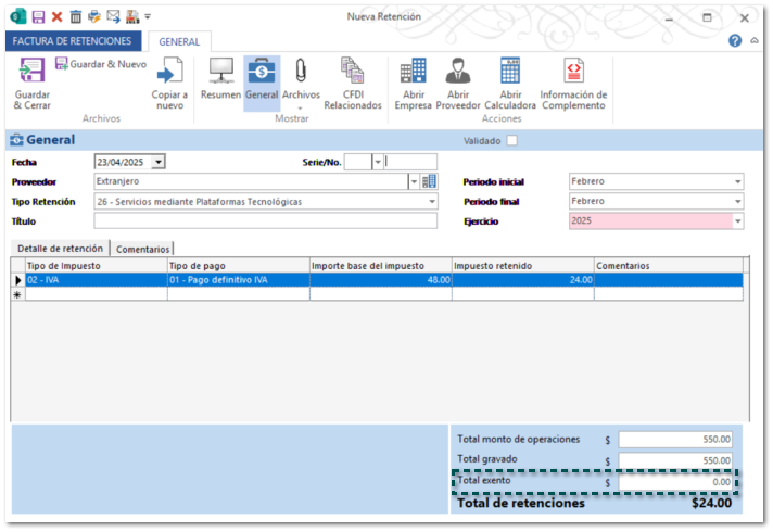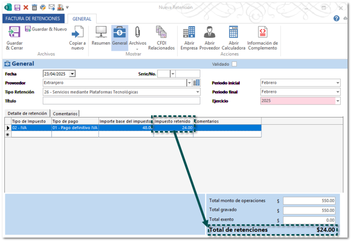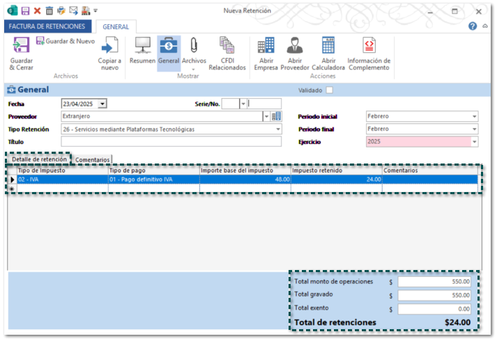Podrás ver que la información del Detalle de retención y el área de totales, se llena e automático.