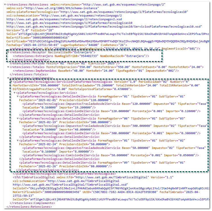 El importe de Total monto de operaciones y Total gravado, es igual al importe de Servicios sin IVA, de los totales del complemento.