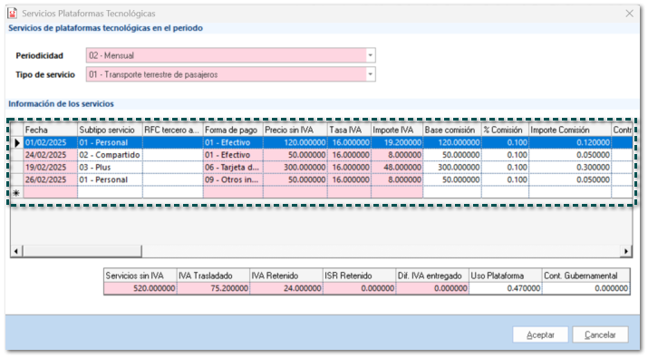 En la sección Información de los servicios, captura los datos de cada servicio que desees registrar en el documento.