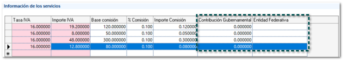 Las columnas Tasa IVA (16.000000) y % Comisión (0.1000) muestran valores por omisión, si lo deseas puedes modificarlos; solo considera que la Tasa IVA, debe contener un valor del catálogo c_TasaCuota, y el % Comisión no debe ser menor a 0.100.