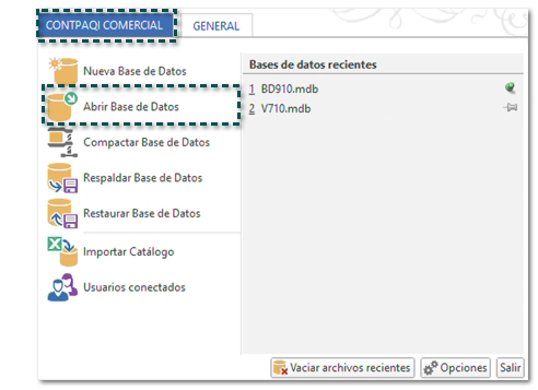 Dentro del sistema, ve al menú CONTPAQI COMERCIAL, en la opción Abrir Base de Datos.