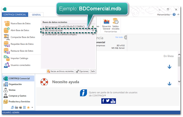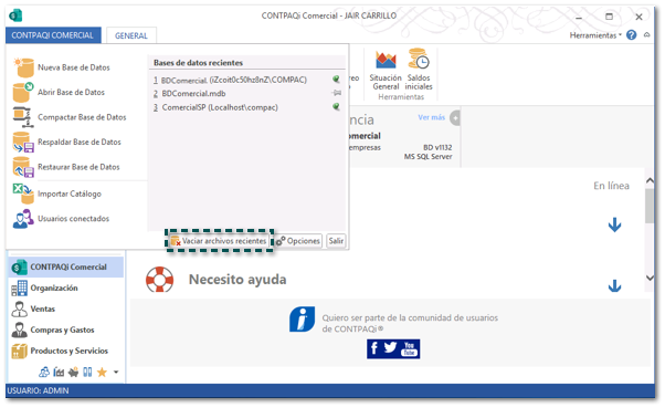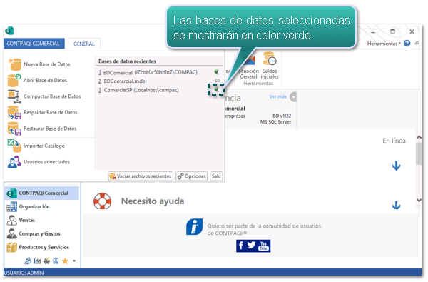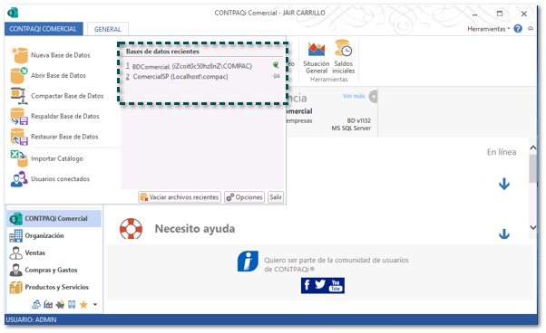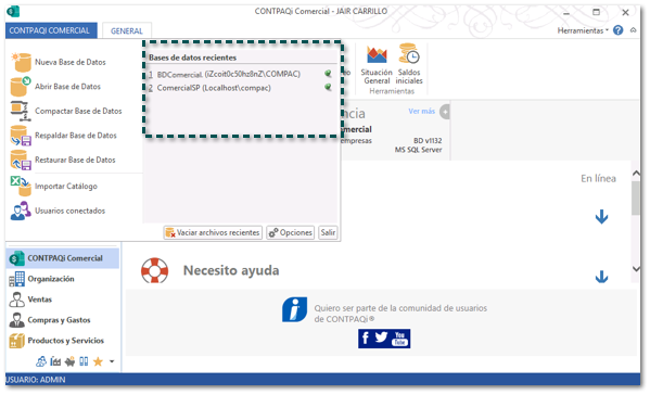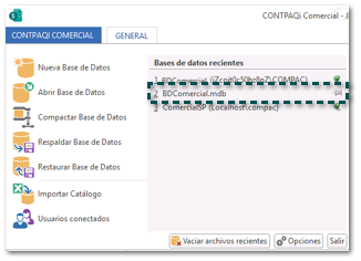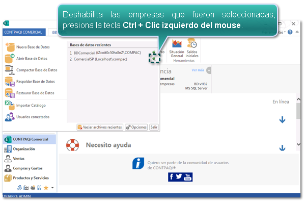 Al ingresar nuevamente al menú CONTPAQI COMERCIAL, las bases de datos que no fueron seleccionadas ya no se muestran en el listado.