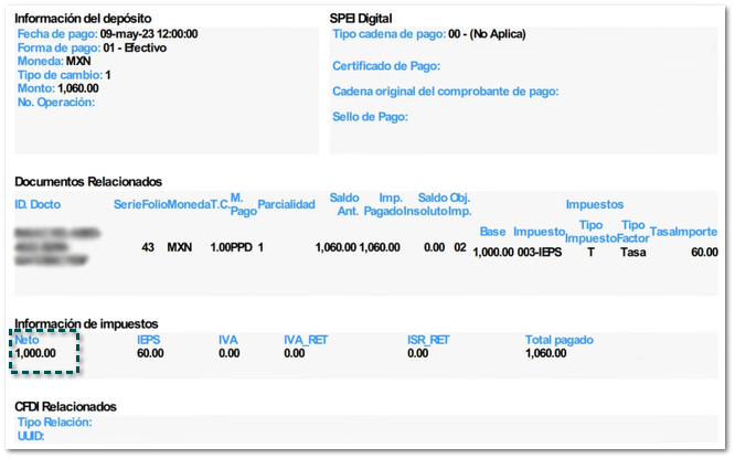 Anteriormente, al consultar el PDF de un documento de Cobro Cliente, se mostraba incorrecto el importe de Neto, ya que este consideraba el importe de IEPS y de IVA.