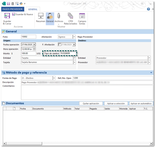 Anteriormente, dentro de los documentos de Pago Proveedor no se mostraba el campo Tipo de cambio, cuando en el campo Entidad de la sección Origen se seleccionaba una tarjeta y esta era en dólar.