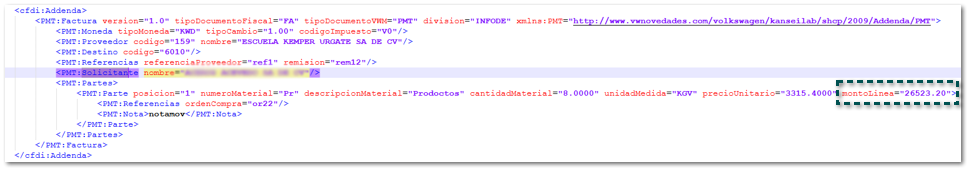 No cumple con el schema de addenda ,The element "Factura" in namespace "http://www.vwnovedades.com/volkswagen/kanseilab/shcp/2009/Addenda/PMT" has invalid child element "Solicitante" in namespace "http://www.vwnovedades.com/volkswagen/kanseilab/shcp/2009/Addenda/PMT". List of possible elements expected: "Nota, Archivo, Partes" in namespace "http://www.vwnovedades.com/volkswagen/kanseilab/shcp/2009/Addenda/PMT".