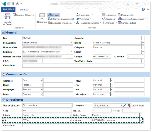 En este Service Pack, al registrar una dirección desde el catálogo de Empresas, será posible seleccionar la colonia INFONAVIT la Huasteca correspondiente al código postal: 66354.