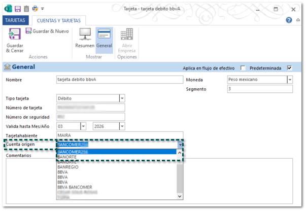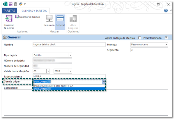 A partir de este Service Pack, desde el catálogo de Tarjetas de la sección Tesorería, únicamente se mostrará el listado de cuentas bancarias registrados para la empresa emisora.