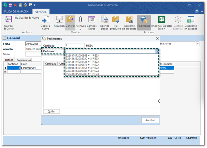 En este Service Pack, al generar un documento de Salida de almacén con productos que manejen pedimentos, se mostrará la existencia correcta, y coincidirá con la información que muestre el reporte Pedimentos de la sección Productos y Servicios.