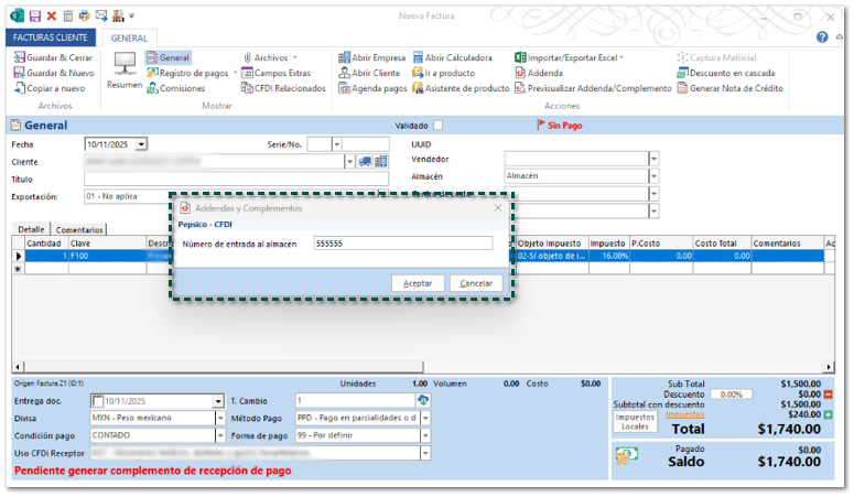 A partir de este Service Pack, al generar un documento de Facturas Cliente cuando se utilice la addenda PEPSICO, podrás capturar a nivel de movimiento de la addenda el Número de entrada al almacén.