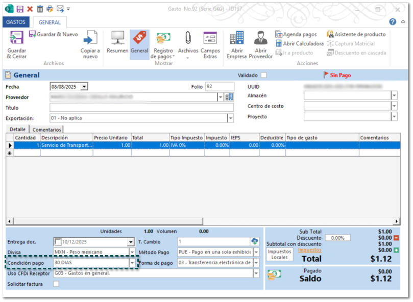 Anteriormente, al generar un documento de gatos a partir de los XML Recibidos no se asignaba ninguna condición de pago, aun cuando el Proveedor tenía asignada una en el catálogo.