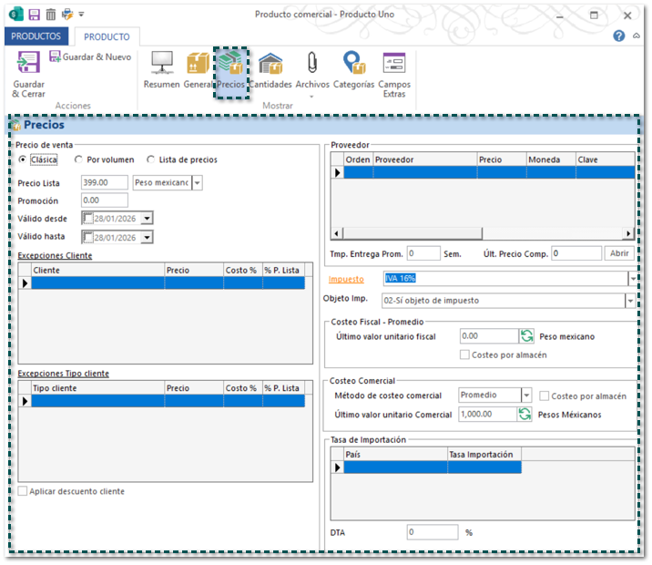 A partir de este Service Pack, al hacer clic en el botón Precios desde el catálogo de Productos, se mostrará la información para que puedas consultarla o realizar algún ajuste.