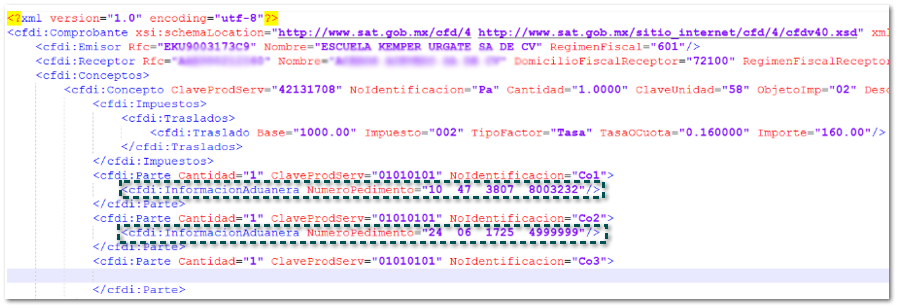 Después de timbrar el documento, al consultar el XML podrás ver que se muestra el nodo InformacionAduanera con el pedimento, dentro del nodo Parte que corresponde al componente.