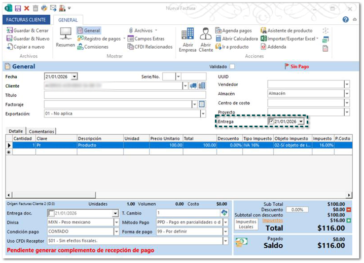 El documento debe tener habilitado y capturado el campo fecha de Entrega, para poder timbrar con la addenda.