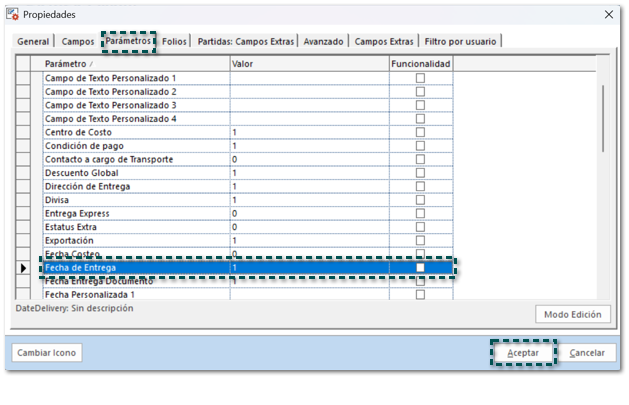 El campo Fecha de Entrega no viene por omisión en el documento, se debe habilitar desde en las Propiedades del concepto, dentro de parámetros en el apartado Componentes, colocando el valor 1 en el campo.