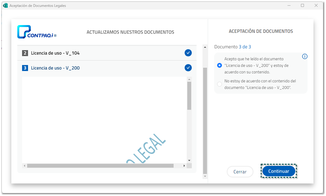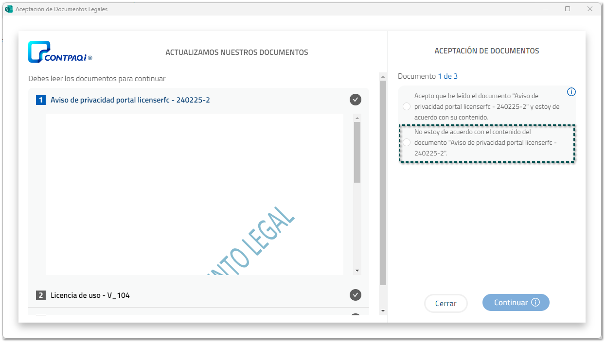 Al momento de tratar de ingresar a una empresa, CONTPAQi Factura Electrónica® validará si existen documentos pendientes por aceptar para ese RFC (empresa) y se mostrará la ventana "Aceptación de Documentos Legales":