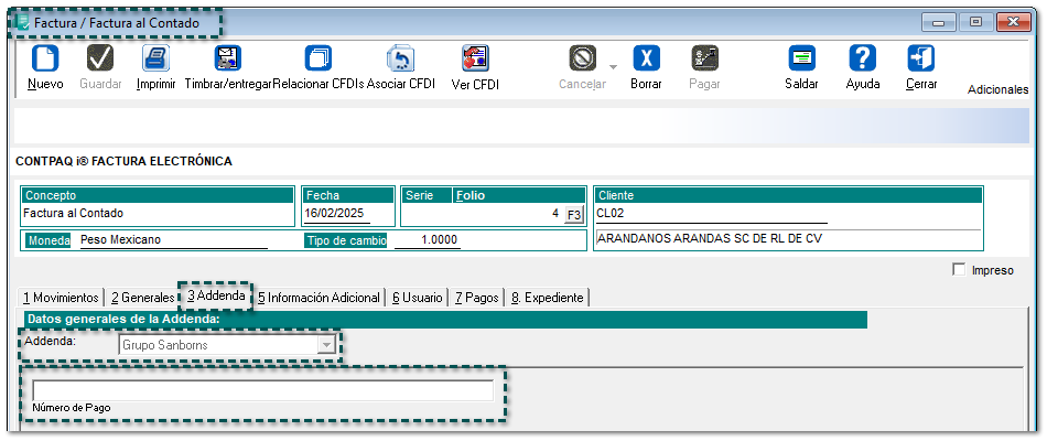 A partir de esta versión, se añade la Addenda Grupo Sanborns a CONTPAQi Factura Electrónica®, con los siguientes campos de captura a nivel de: