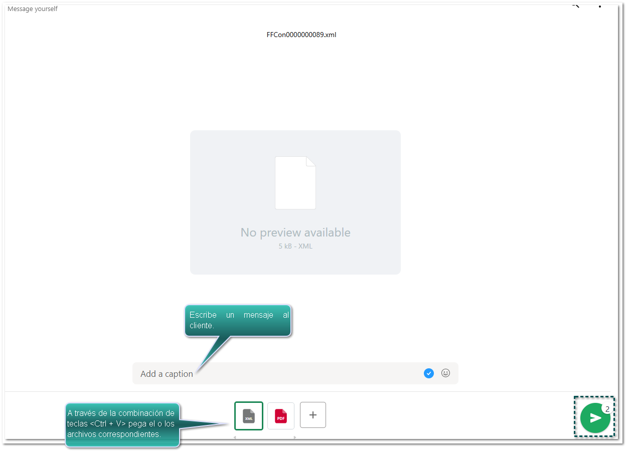 Al Enviar y/o Timbrar documentos, se abrirá WhatsApp Escritorio, elige al Cliente, pega los archivos mediante la combinación de teclas <Ctrl + V>, y haz clic en el botón Enviar.