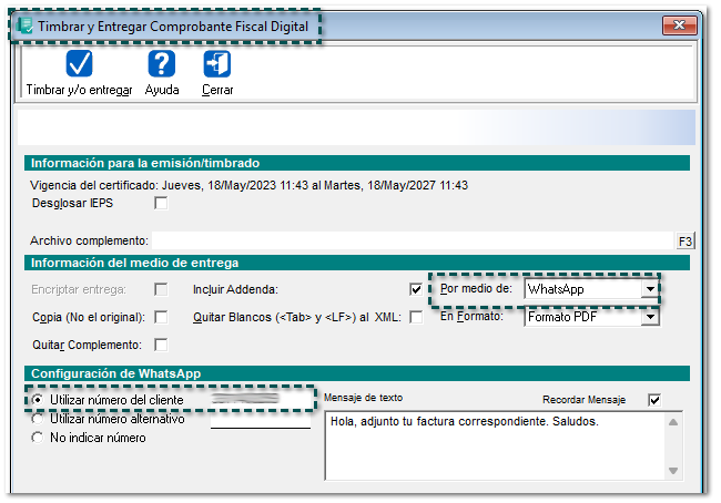Desde las ventanas de Timbrado y/o Envío de Documentos Digitales, podrás seleccionar en el campo "Por medio de": la opción WhatsApp, para poder enviar el documento a tú cliente.