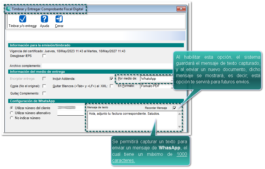 Además, se podrá capturar texto para enviarlo al cliente a través del WhatsApp, y podrás habilitar la opción "Recordar mensaje", para futuros envíos de documentos al cliente.