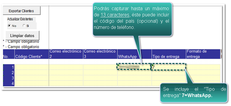 En la pestaña Clientes del Modelo "Importación de Catálogos", se adiciona la opción 7 = WhatsApp para poder capturar el número correspondiente del cliente y poder exportar a tu sistema comercial dichos números de manera masiva.