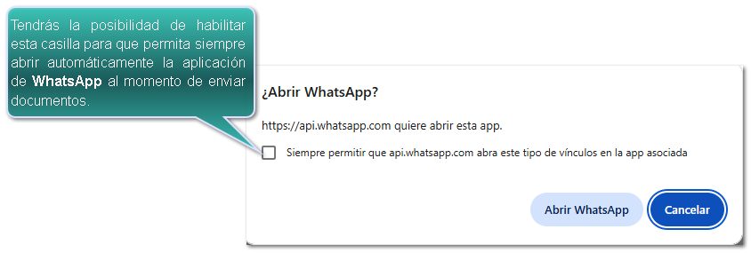 Si se tiene instalado WhatsApp Escritorio, aparecerá un mensaje preguntando si se desea permitir que siempre whatsapp abra este tipo de vínculos en la app asociada.